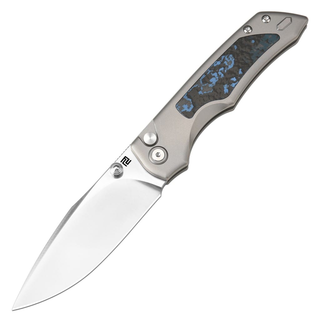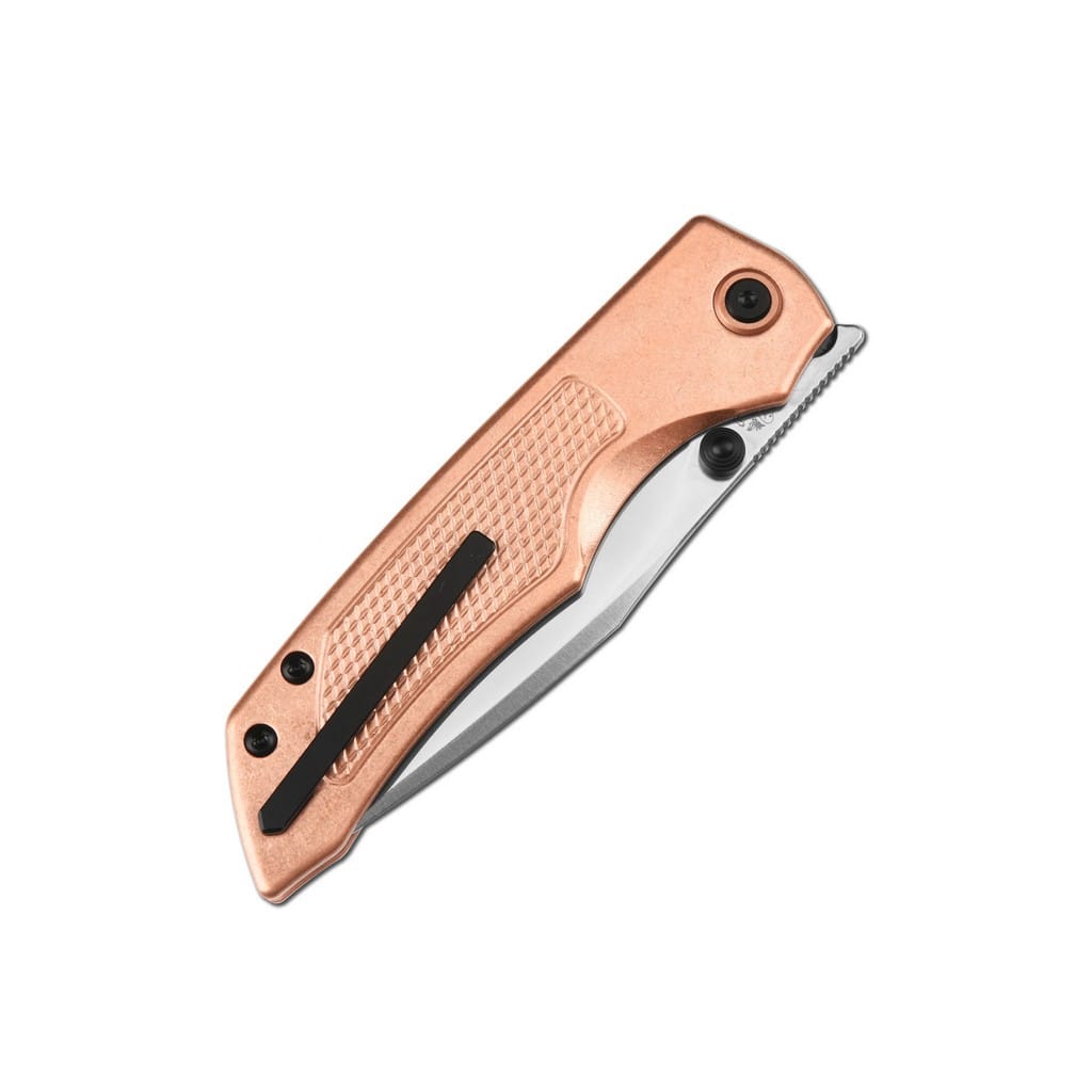 Wizard firmy Artisan Cutlery to wyrafinowany folder dżentelmeński zaprojektowany z największą dokładnością, aby spełnić oczekiwania nawet najbardziej wymagających miłośników noży. Model posiada ostrze o uniwersalnym profilu Drop Point wykonane z amerykańskiej stali nierdzewnej klasy premium CPM S90V. Duże ilości wanadu w składzie wpływają na jej wyjątkową odporność na zużycie. Wykończenie głowni metodą Sand Polish pozostawia drobne ryski lekko matujące powierzchnię, dające efekt niedokładnego wypolerowania. Klingę osadzono na ceramicznych łożyskach kulkowych, która przy wykorzystaniu obustronnego kołka lub front flippera wysuwa się płynnie i gładko. Prosta obsługa jedną ręką zadowoli zarówno osoby prawo, jak i leworęczne. Dodatkowo narzędzie można alternatywnie rozłożyć za pomocą intuicyjnego przycisku na rękojeści. Karbowanie na grzbiecie ostrza stanowi stabilne wsparcie dla kciuka i pomaga przy precyzyjnych pracach. Skuteczna blokada Button Lock chroni przed przypadkowym złożeniem się noża, gdy jest w użyciu. Okładziny chwytu zrobiono z pięknie prezentującej się miedzi o właściwościach antybakteryjnych. Frezowanie na jej powierzchni zwiększające przyczepność do dłoni oraz głębokie wyprofilowanie pod palec poprawiają komfort użytkowania. Konstrukcję uzupełnia dwupozycyjny klips mocujący z tytanu pozwalający na wygodne przenoszenie foldera w kieszeni spodni. W zestawie znajduje się ściereczka z mikrofibry oraz czarne etui transportowe z miękkim wnętrzem i zamykaniem na suwak, a całość zapakowano w białe pudełko prezentowe. Artisan Cutlery to firma tworząca estetyczne i innowacyjne noże, przy jednoczesnym zachowaniu metod tradycyjnego rzemiosła i dbałości o szczegóły. Jej zespół specjalistów, z bogatym i długoletnim doświadczeniem w branży, jest sukcesem niezawodności i wydajności na najwyższym poziomie.