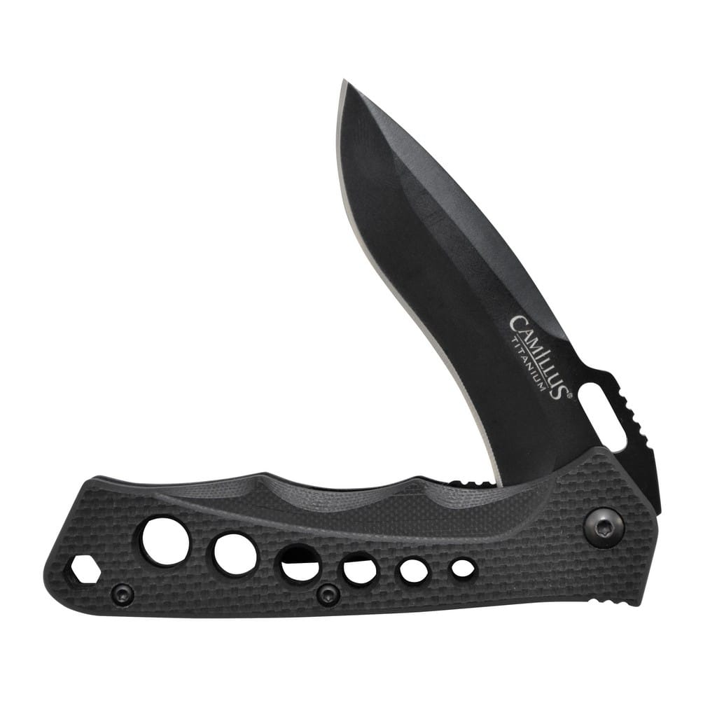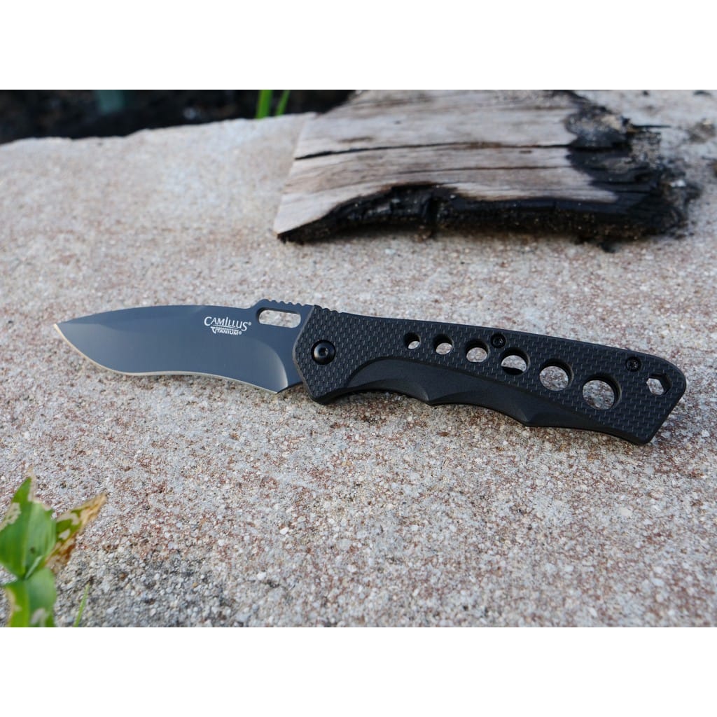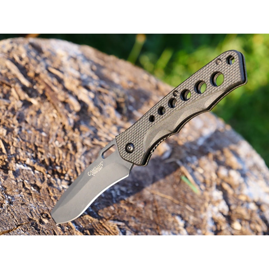 Camillus Rage to przystępny cenowo taktyczny nóż składany, zaprojektowany do codziennego użytku. Model posiada ostrze o uniwersalnym profilu Drop Point z kształtem fali, wykonane ze stali nierdzewnej 440. Pokryto ją opatentowaną przez producenta czarną powłoką Carbonitride Titanium. Jest to związek tytanu tworzący nieprzywierającą warstwę ochronną, która czyni klingę o dziesięć razy twardszą w stosunku do nieobrobionej stali. Dodatkowo zabezpiecza przed korozją i rysowaniem się powierzchni. W szybkim rozłożeniu narzędzia jedną ręką pomaga otwór na głowni. Bezpieczeństwo pracy zapewnia klasyczny mechanizm Liner Lock oraz karbowanie na grzbiecie noża stanowiące stabilne wsparcie dla kciuka. Czarne okładziny chwytu zrobiono z nylonu wzmocnionego włóknem szklanym o antypoślizgowej fakturze zwiększające przyczepność do dłoni. Rękojeść charakteryzuje się również ergonomicznym wyprofilowaniem pod zaciskające się palce, co gwarantuje pewny chwyt w każdych warunkach. Na zakończeniu znajduje się sześciokątny otwór na linkę umożliwiający przełożenie breloka ozdobnego lub paracordu. Konstrukcję uzupełnia klips mocujący do wygodnego przenoszenie foldera w kieszeni spodni lub przy wyposażeniu. Firma Camillus Cutlery od 1876 roku dostarcza niezawodne narzędzia, które wytrzymują próbę czasu. Jest to jeden z najstarszych amerykańskich producentów noży, cieszący się uznaniem na całym świecie.