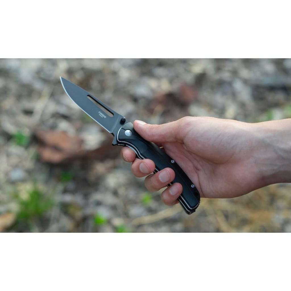 Camillus Shiloh to folder EDC o taktycznym wyglądzie, oferujący niezawodność w każdej sytuacji. Ostrze o uniwersalnym profilu Drop Point zostało wykonane ze stali nierdzewnej 8Cr13MoV. W celu ochrony głowni przed korozją i negatywnym działaniem czynników zewnętrznych pokryto ją czarną i antyodblaskową powłoką. Klingę osadzono na łożyskach kulkowych, która przy wykorzystaniu otworu, obustronnego kołka lub flippera, pełniącego jednocześnie funkcję jelca, wysuwa się płynnie i gładko. Prosta obsługa jedną ręką zadowoli zarówno osoby prawo, jak i leworęczne. Nad bezpieczeństwem użytkownika podczas pracy czuwa klasyczny mechanizm Liner Lock. Rękojeść z odpornego na warunki atmosferyczne materiału G10 posiada karbowany grzbiet oraz głębokie wyprofilowanie pod palec. Gwarantuje to dobrą przyczepność do dłoni i pewny chwyt w każdym środowisku. Na zakończeniu znajduje się otwór na linkę umożliwiający przełożenie breloka ozdobnego lub paracordu. Konstrukcję uzupełnia klips mocujący do wygodnego przenoszenie foldera w kieszeni spodni lub przy wyposażeniu. Firma Camillus Cutlery od 1876 roku dostarcza niezawodne narzędzia, które wytrzymują próbę czasu. Jest to jeden z najstarszych amerykańskich producentów noży, cieszący się uznaniem na całym świecie.