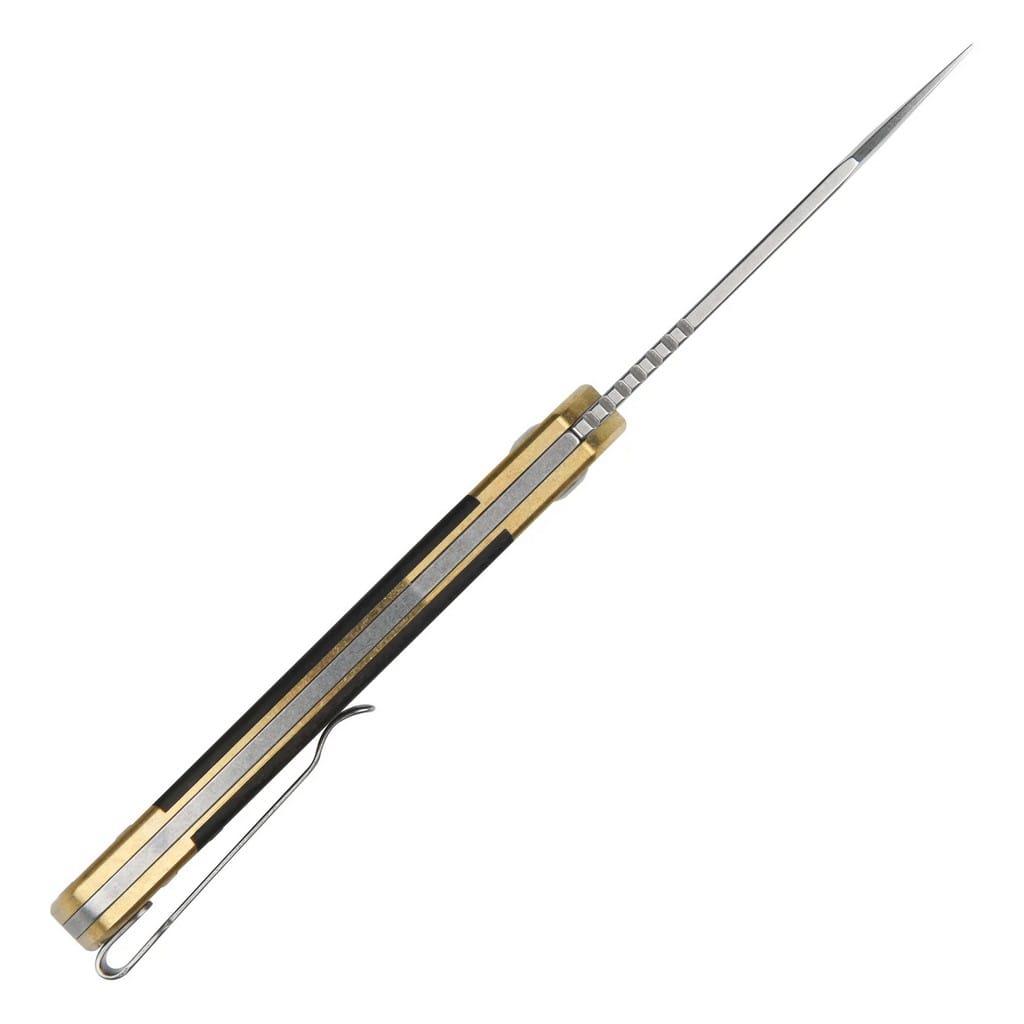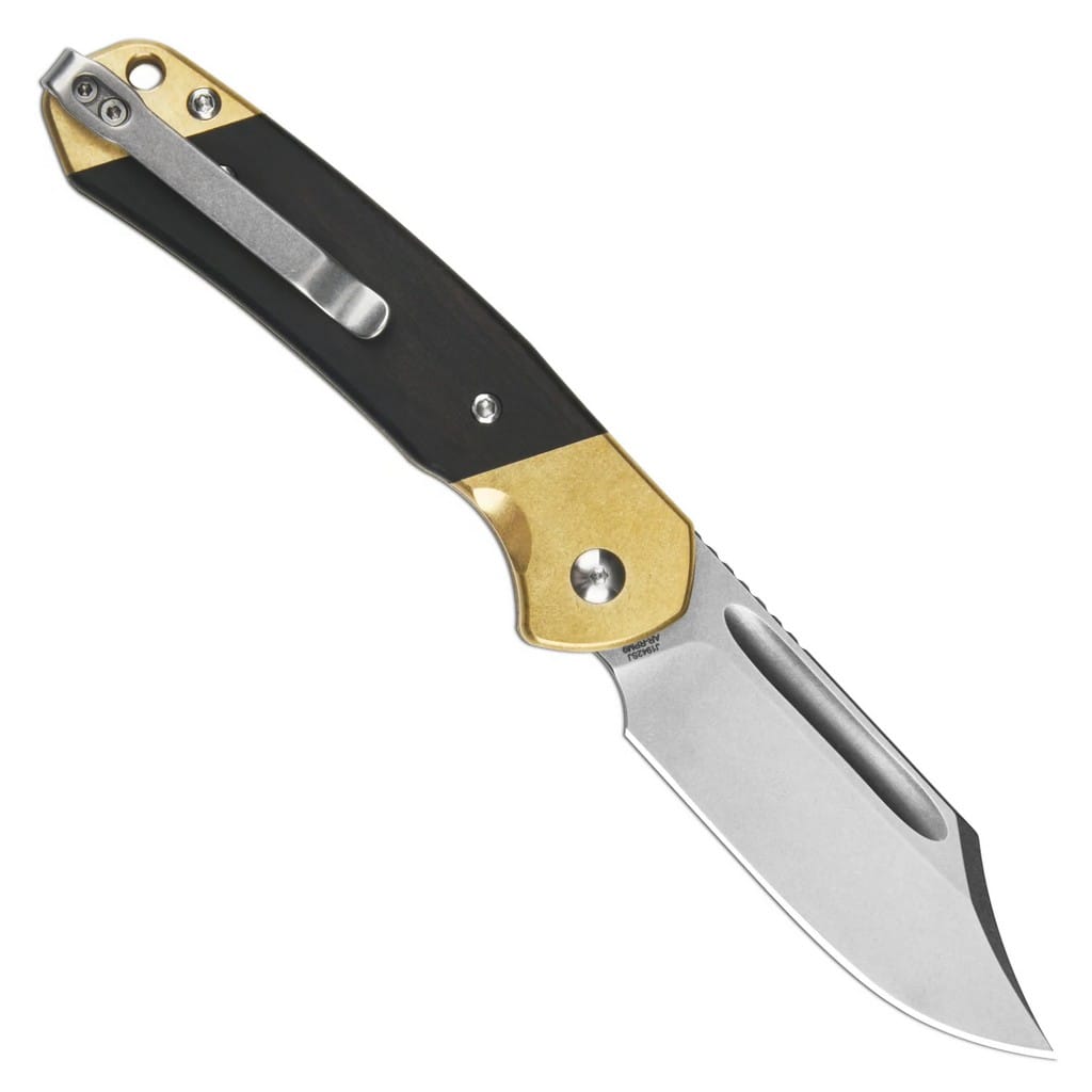 Pyrite firmy CJRB Cutlery to prosty w obsłudze, elegancki folder EDC zaprojektowany do codziennej pracy. Drapieżne ostrze o profilu Bowie zostało zrobione z nierdzewnej stali proszkowej AR-RPM9, produkowanej i zastrzeżonej przez Artisan Cutlery. Charakteryzuje się ona wysoką odpornością na korozję, długo utrzymuje ostrą krawędź tnącą oraz jest łatwa w utrzymaniu i w ostrzeniu. Wykończenie głowni metodą Stonewash pozostawia nieregularną powłokę dobrze maskującą rysy powstające podczas eksploatacji. Klingę osadzono na ceramicznych łożyskach kulkowych, która przy wykorzystaniu podłużnego, obustronnego zagłębienia na palec wysuwa się płynnie i gładko. Karbowany grzbiet ostrza stanowi stabilne wsparcie dla kciuka, co pomaga przy precyzyjnych zadaniach. Blokada Slip Joint powoduje, że głownia w pozycji otwartej zapada bezpiecznie dzięki sprężynie, zaś do jej złożenia należy jedynie użyć odpowiedniej siły. Rękojeść składa się z mosiężnego bolstera i naturalnych okładzin z drewna. Dodatkowo delikatne wyprofilowanie pod palec gwarantuje komfortowe użytkowanie. Na zakończeniu umieszczono otwór umożliwiający przełożenie breloka ozdobnego lub paracordu. Całość dopełnia dwupozycyjny klips mocujący pozwalający na głębokie przenoszenie noża w kieszeni spodni. W zestawie znajduje się ściereczka z mikrofibry oraz pokrowiec z miękkim wnętrzem i zamykaniem na suwak do wygodnego transportowania narzędzia. CJRB to przystępna cenowo marka własna firmy Artisan Cutlery, która narodziła się z pragnienia, aby jakość i wydajność oferowanych produktów była dostępna dla wszystkich, bez kompromisów w zakresie materiałów, czy konstrukcji. Noże CJRB tworzone są przez zespół zajmujący się również linią premium, dlatego możemy spodziewać się kunsztu i tej samej dbałości o szczegóły, co w droższych egzemplarzach.