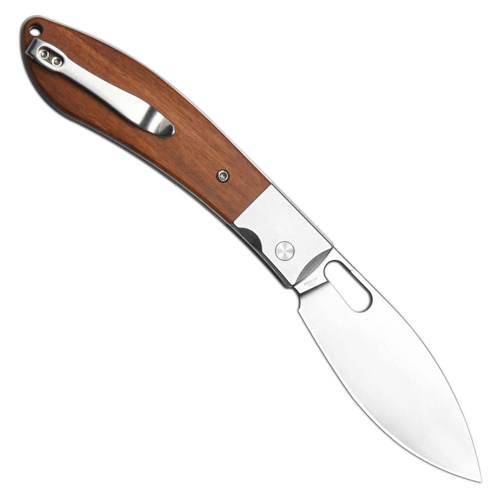 Model Sasaya, zaprojektowany przez firmę CJRB Cutlery, to prosty i elegancki folder, który dzięki wszechstronnej budowie doskonale sprawdzi się do wielu zadań w domu i na świeżym powietrzu. Szerokie ostrze, kształtem przypominające liść bambusa, wykonano z nierdzewnej stali proszkowej AR-RPM9, opatentowanej i produkowanej przez Artisan Cutlery. Charakteryzuje się ona wysoką odpornością na korozję, długo utrzymuje ostrą krawędź tnącą oraz jest łatwa w utrzymaniu i w ostrzeniu. Wykończenie jej metodą Stonewash pozostawia nieregularną powłokę dobrze maskującą rysy powstające podczas eksploatacji. Klingę osadzono na ceramicznych łożyskach kulkowych, która przy wykorzystaniu otworu na głowni wysuwa się płynnie i gładko. Prosta obsługa jedną ręką zadowoli zarówno osoby prawo, jak i leworęczne. Alternatywnie narzędzie można rozłożyć za pomocą intuicyjnego przycisku na rękojeści. Blokada Button Lock chroni skutecznie przed przypadkowym złożeniem się noża, gdy jest w użyciu. Chwyt składa się ze stalowego bolstera i okładzin z naturalnego drewna. Na zakończeniu umieszczono dziurkę umożliwiającą przełożenie breloka ozdobnego lub paracordu. Dodatkowo dwupozycyjny klips mocujący pozwala na przenoszenie foldera w kieszeni spodni lub przy wyposażeniu. W zestawie znajduje się ściereczka z mikrofibry oraz pokrowiec z miękkim wnętrzem i zamykaniem na suwak do wygodnego przechowywania i transportowania narzędzia. CJRB to przystępna cenowo marka własna firmy Artisan Cutlery, która narodziła się z pragnienia, aby jakość i wydajność oferowanych produktów była dostępna dla wszystkich, bez kompromisów w zakresie materiałów, czy konstrukcji. Noże CJRB tworzone są przez zespół zajmujący się również linią premium, dlatego możemy spodziewać się kunsztu i tej samej dbałości o szczegóły, co w droższych egzemplarzach.