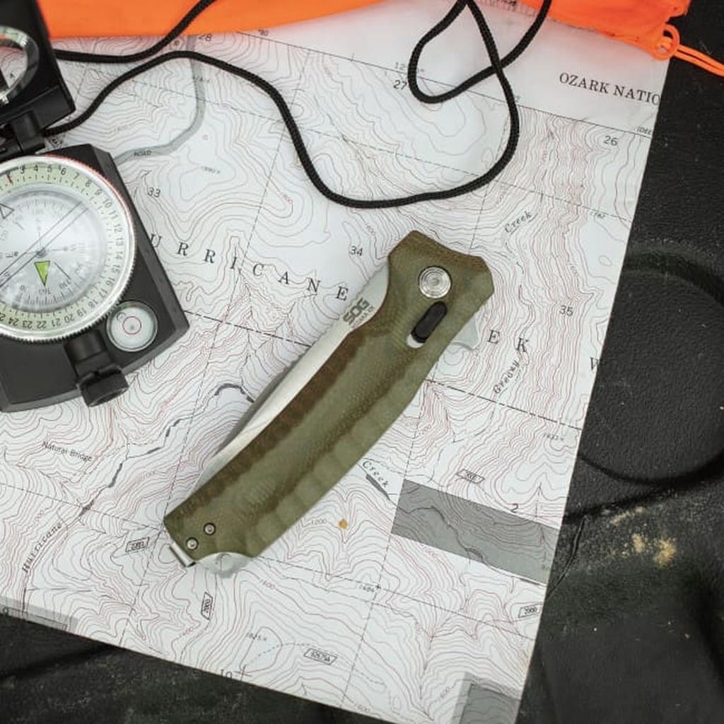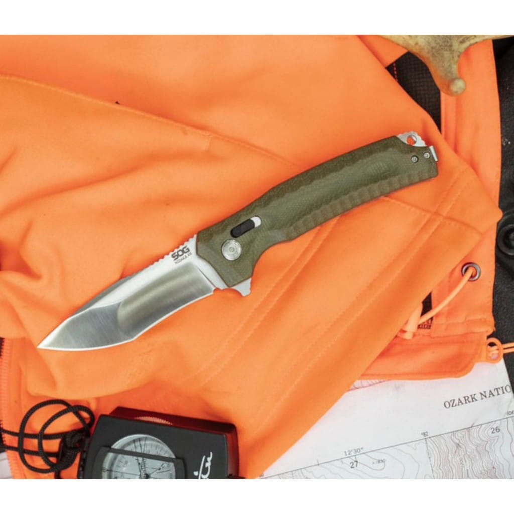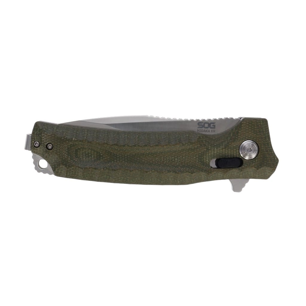 SOG Hidaka XR to stylowy i niezwykle funkcjonalny nóż składany, zaprojektowany przez legendarnego japońskiego knifemakera Kiku Matsudę. Model został starannie wykonany z najwyższej jakości materiałów. Stanowi nie lada gratkę dla kolekcjonerów oraz profesjonalistów poszukujących niezawodnego narzędzia do pracy. Ostrze posiada hybrydowy profil będący połączeniem kształtu Drop Point i Tanto. Głownię zrobiono z amerykańskiej stali proszkowej CPM 3V charakteryzującej się niezwykłą twardością, odpornością na pękanie i wykruszenia oraz bardzo dobrym trzymaniem ostrości. Wykończenie jej metodą Satin pozostawia drobne ryski lekko matujące powierzchnię, dające efekt niedokładnego wypolerowania. Klingę można szybko i sprawnie rozłożyć jedną ręką za pomocą flippera, pełniącego jednocześnie funkcję jelca lub przy wykorzystaniu suwaka znajdującego się na rękojeści. Nad bezpieczeństwem, gdy narzędzie jest w użyciu, czuwa innowacyjny system blokujący XR Lock. Karbowany grzbiet ostrza daje stabilne wsparcie dla kciuka, co poprawia komfort chwytu i pomaga przy precyzyjnych zadaniach. Okładziny z zielonej Micarty oferują dobre dopasowanie do ręki. Rękojeść jest lekka, odporna na wilgoć, ciepło i uderzenia, co sprawia, że pozostanie wydajna przez długi czas. Antypoślizgowe krawędzie i wcięcie pod palec gwarantują dobrą przyczepność, nawet w mokrych dłoniach. Na zakończeniu znajduje się otwór na linkę umożliwiający przełożenie paracordu lub breloka ozdobnego. Konstrukcję uzupełnia dwupozycyjny klips mocujący do wygodnego przenoszenia noża w kieszeni spodni lub przy wyposażeniu. Hidaka XR to model klasy premium, który świetnie sprawdzi się jako niezawodne narzędzie do codziennych aktywności w domu i w terenie.