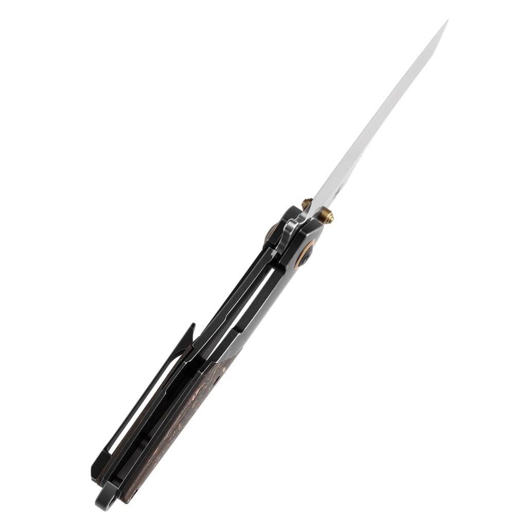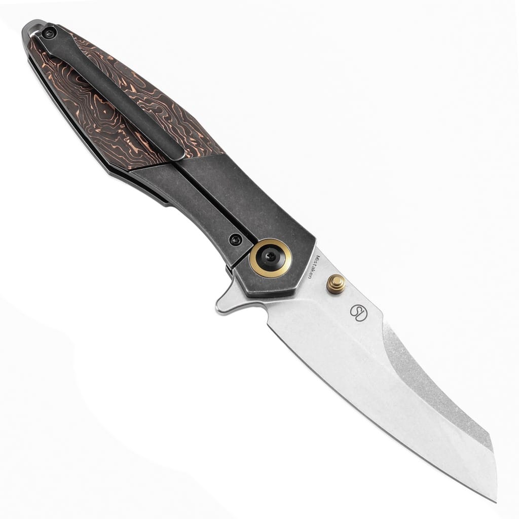 Wysokiej jakości model Mistaken to efekt współpracy Jonathan Styles z Kansept Knives. Folder przyciąga uwagę nowoczesnym i dopracowanym designem oraz dbałością o szczegóły. Jest to idealny wybór zarówno dla entuzjastów i kolekcjonerów noży, jak i osób szukających niezawodnego narzędzia na co dzień. Ostrze o zmodyfikowanym profilu Wharncliffe wykonano z amerykańskiej stali nierdzewnej klasy premium CPM 20CV o dużej zawartości chromu, co zwiększa odporność na korozję i pozwala długo utrzymać właściwą ostrość krawędzi tnącej. Wykończenie jej metodą Stonewash pozostawia nieregularną powłokę dobrze maskującą rysy i zadrapania powstające podczas eksploatacji. Klingę osadzono na ceramicznych łożyskach kulkowych, która przy wykorzystaniu obustronnego kołka lub dużego flippera, pełniącego jednocześnie funkcję jelca, wysuwa się płynnie i gładko. Solidny i niezawodny mechanizm Frame Lock chroni przed przypadkowym złożeniem się głowni, gdy jest w użyciu. Do ergonomicznie wyprofilowanej ramy z tytanu przymocowano okładziny z włókna węglowego wzbogaconego o elementy miedzi. Dodatkowo konstrukcję zdobią złote akcenty, które nadają unikatowy charakter całości. Na zakończeniu umieszczono otwór umożliwiający przełożenie breloka ozdobnego lub paracordu. Dopełnienie stanowi tytanowy klips mocujący do wygodnego przenoszenie narzędzia w kieszeni spodni. W zestawie znajduje się ściereczka z mikrofibry oraz gatunkowy pokrowiec transportowy, a całość zapakowano w czarne pudełko prezentowe. Kansept Knives to uosobienie najnowocześniejszych technologii i praktycznego wzornictwa. Jej motto brzmi “Nie tylko produkujemy noże, czynimy je lepszymi”, co doskonale oddaje osobowość tej marki. Firma wyróżnia się z tłumu innowacyjnymi koncepcjami angażując do współpracy najlepszych projektantów z branży. Każdy element jest skrupulatnie obrabiany, za pomocą zaawansowanych maszyn lub ręcznie, tworząc znakomite połączenie kunsztu i estetyki.