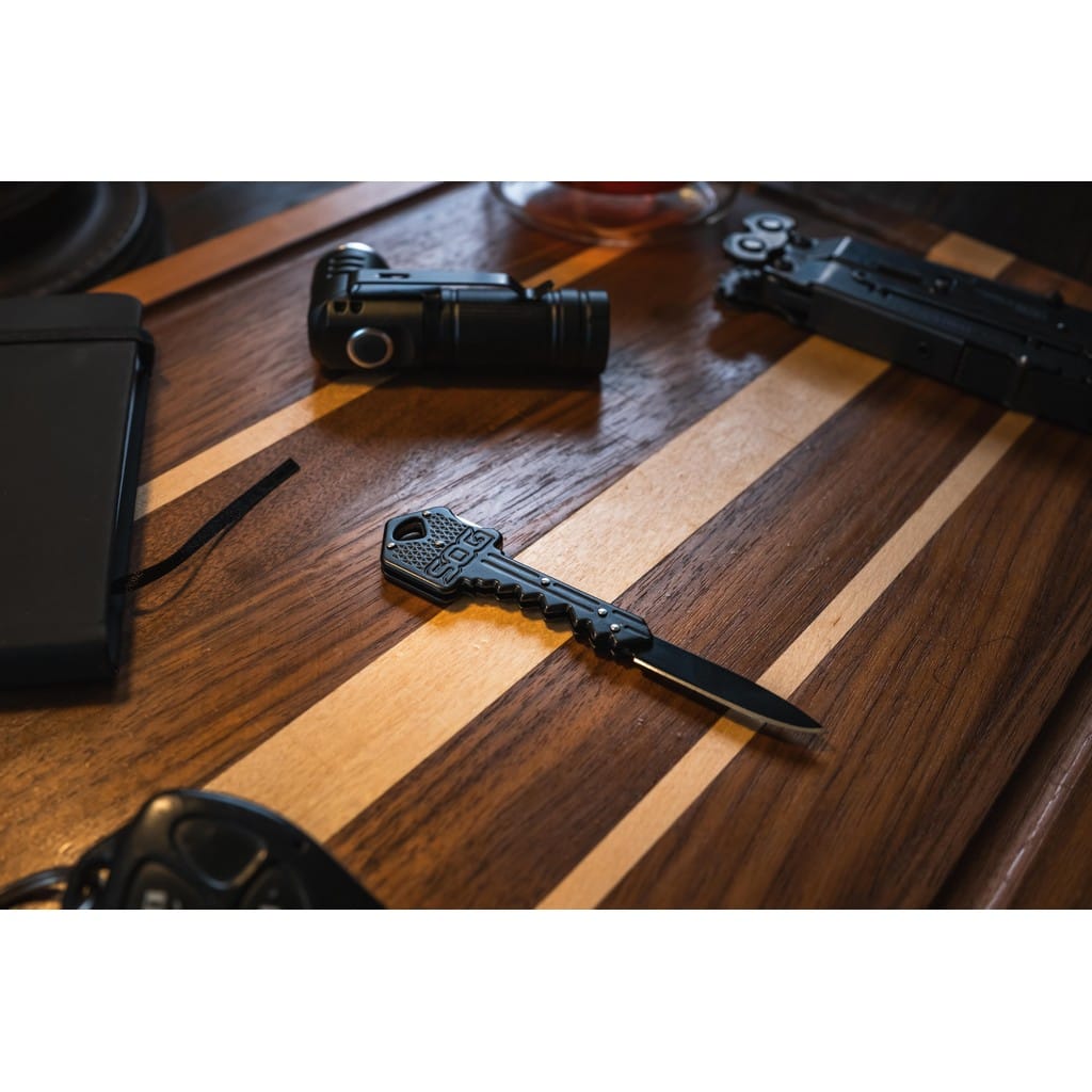 Najlepszy nóż, to taki, który możemy mieć zawsze przy sobie. Właśnie takim jest składany model z obudową w kształcie klucza od domu wyprodukowany przez firmę Sog. Jest niewielkich wymiarów, niezwykle lekki, a w dodatku nie będzie rzucał się w oczy, gdy dopniemy go do pęka kluczy, które nosimy zawsze przy sobie. Posiada obudowę ze stali nierdzewnej w czarnym kolorze, a sam nóż o długości prawie 4 centymetrów posiada blokadę lock back, która chroni przed przypadkowym złożeniem się ostrza. Doskonały gadżet, który ułatwi otwieranie paczek, listów czy cięcie taśm.