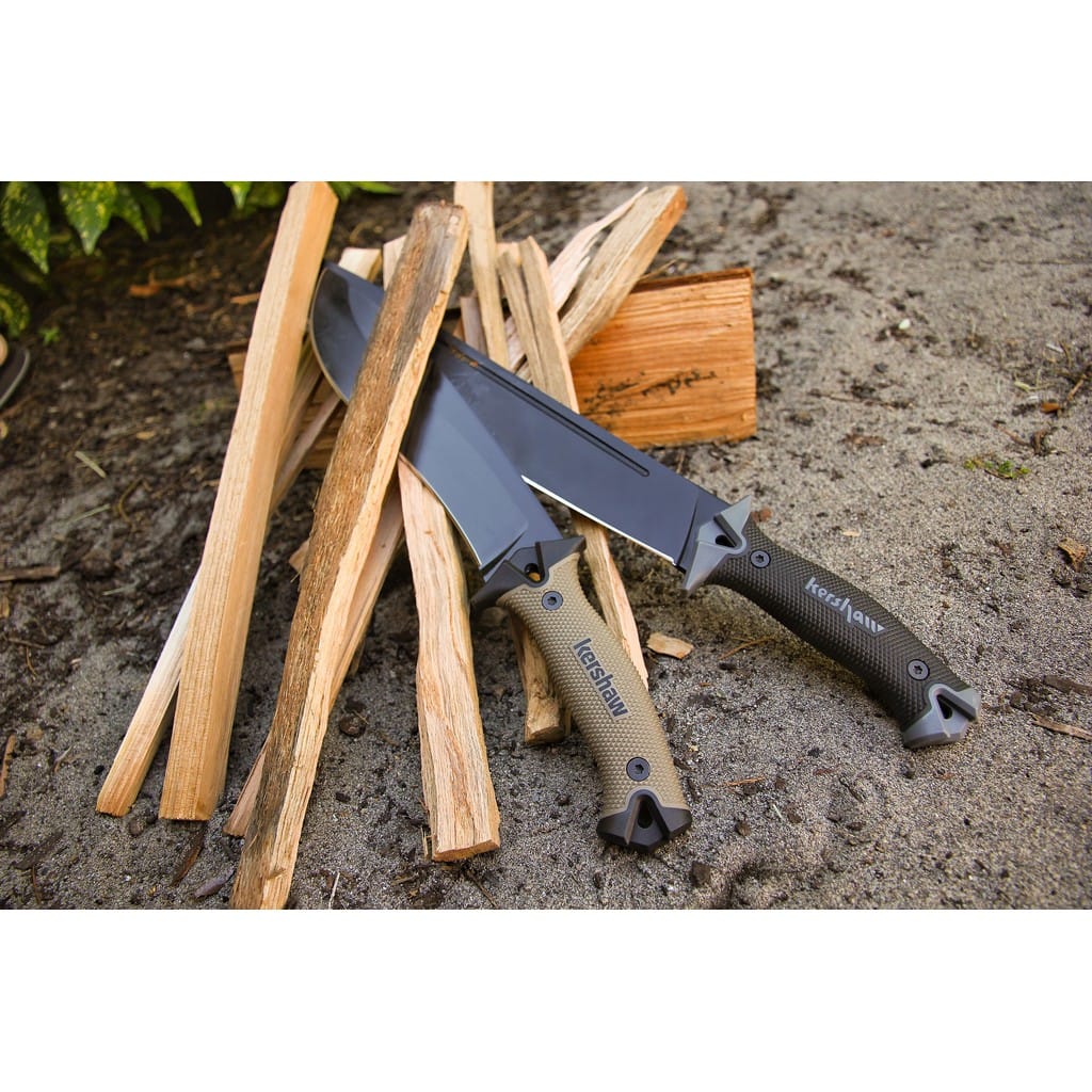 Camp 10 to popularna maczeta survivalowa firmy Kershaw zaprojektowana do prac obozowych. Kompaktowe rozmiary ułatwiają jej transportowanie w czym pomaga dołączona pochwa wykonana z nylonu wzmocnionego włóknem szklanym. Możemy z łatwością zamocować ją na nodze, przy pasie lub wyposażeniu za pomocą taśm, które posiada. Model wykonano z jednego kawałka stali węglowej 65Mn, dzięki czemu doskonale nadaje się do ciężkiej i wymagającej pracy, a gdy krawędź tnąca ulegnie stępieniu łatwo i szybko ponownie przywrócimy jej ostrość. Głownia pokryta proszkowo czarną farbą sprawdzi się nawet w najbardziej ekstremalnych warunkach oraz ochroni przed korozją i wyeliminuje odbijanie światła. Gumowa rękojeść nie tylko redukuje zmęczenie dłoni podczas długotrwałej pracy ale także amortyzuje drgania przenoszone przez klingę. Bezpieczeństwu pracy sprzyja obustronny jelec, który zabezpiecza rękę przed zsunięciem się na ostrze. Dla większej użyteczności maczeta posiada dwa otwory w uchwycie pozwalające na przełożenie linki i jej wszechstronne przenoszenie. Camp 10 idealnie sprawdzi się w lesie, przy pracach ogrodowych jak również do innych aktywności outdoorowych.
