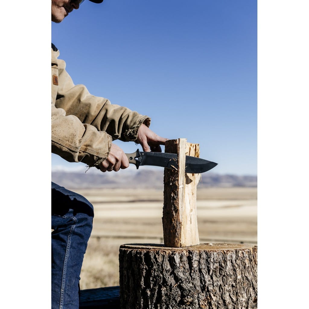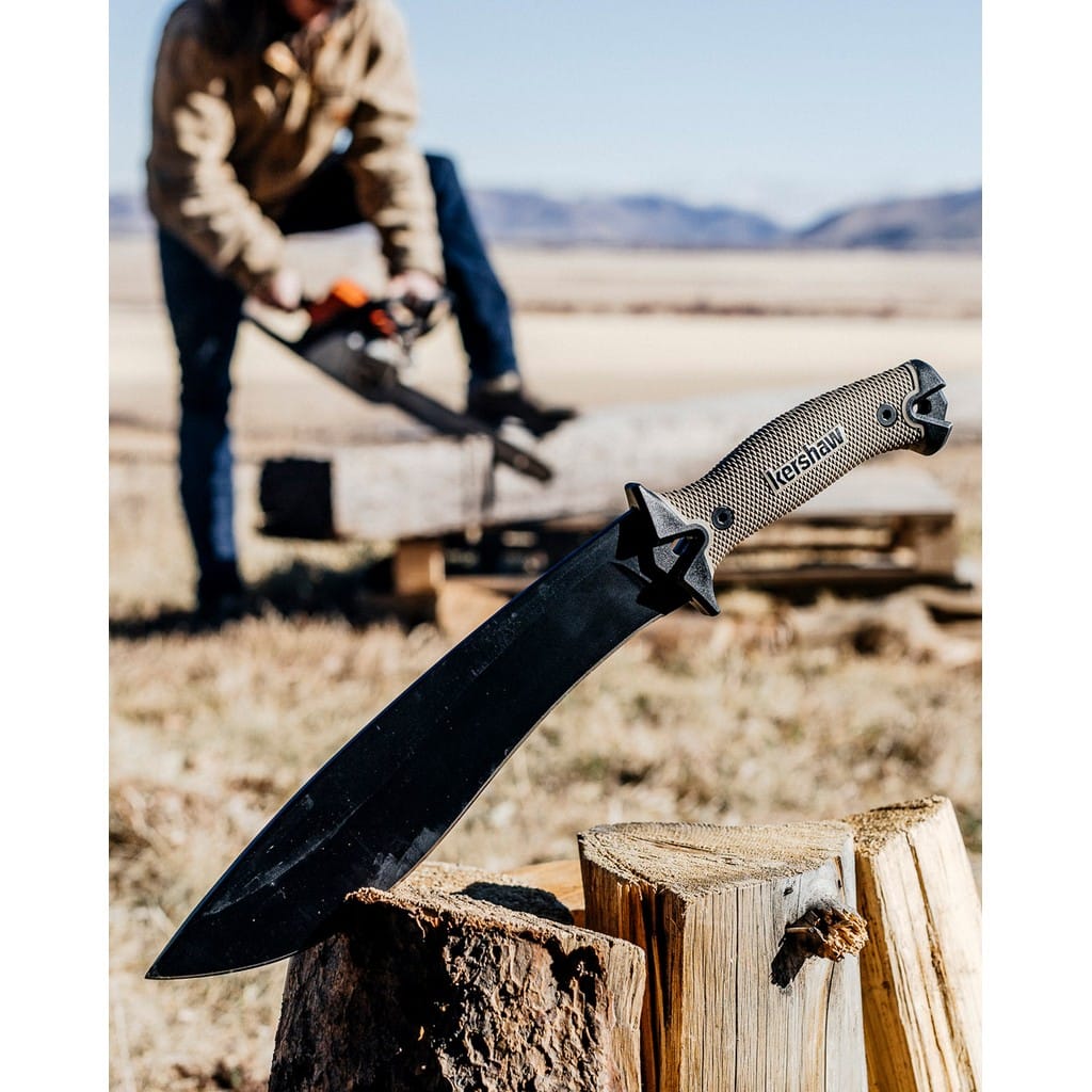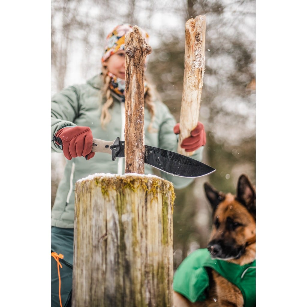 Camp 10 to popularna maczeta survivalowa firmy Kershaw zaprojektowana w jasnobrązowej kolorystyce. Kompaktowe rozmiary ułatwiają jej transportowanie w czym pomaga dołączona pochwa wykonana z nylonu wzmocnionego włóknem szklanym. Możemy z łatwością zamocować ją na nodze, przy pasie lub wyposażeniu za pomocą taśm, które posiada. Model wykonano z jednego kawałka stali węglowej 65Mn, dzięki czemu doskonale nadaje się do ciężkiej i wymagającej pracy, a gdy krawędź tnąca ulegnie stępieniu łatwo i szybko ponownie przywrócimy jej ostrość. Głownia pokryta proszkowo czarną farbą sprawdzi się nawet w najbardziej ekstremalnych warunkach oraz ochroni przed korozją i wyeliminuje odbijanie światła. Gumowa rękojeść nie tylko redukuje zmęczenie dłoni podczas długotrwałej pracy ale także amortyzuje drgania przenoszone przez klingę. Bezpieczeństwu pracy sprzyja obustronny jelec, który zabezpiecza rękę przed zsunięciem się na ostrze. Dla większej użyteczności maczeta posiada dwa otwory w uchwycie pozwalające na przełożenie linki i jej wszechstronne przenoszenie. Camp 10 idealnie sprawdzi się w lesie, przy pracach ogrodowych jak również do innych aktywności outdoorowych.