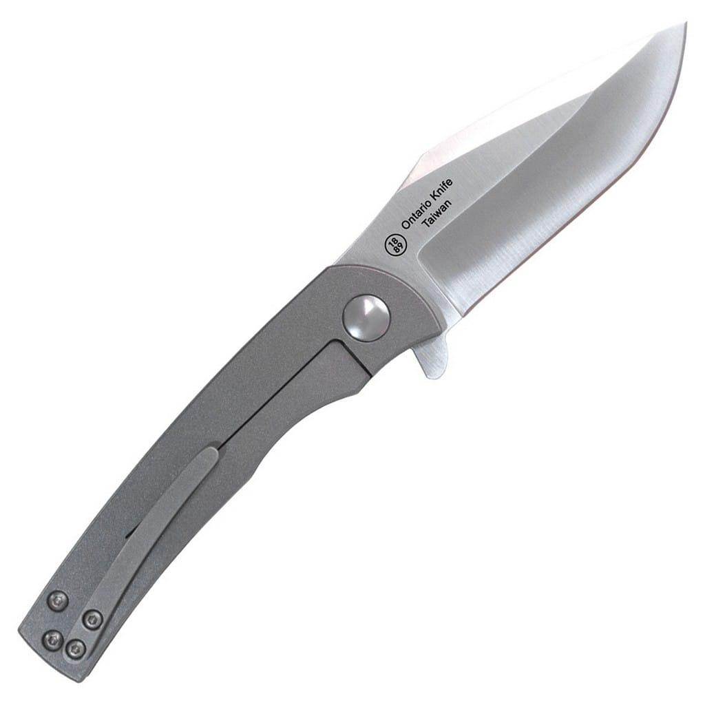 Trinity to kompaktowy nóż składany do codziennego noszenia zaprojektowany dla firmy Ontario Knife przez Roberta Cartera, syna znanego i cenionego knifemakera Joe Pardue. Szerokie ostrze typu Drop Point wykonano z japońskiej stali nierdzewnej AUS-8 o bardzo dobrych parametrach użytkowych. Klingę wykończono metodą Satin pozostawiającą drobne ryski lekko matujące powierzchnię, co daje efekt niedokładnego wypolerowania. W szybkim wysunięciu głowni pomaga sporych rozmiarów flipper pełniący jednocześnie funkcję jelca, chroniącego przed przypadkowym zsunięciem się palców na krawędź tnącą. Bezpieczeństwo pracy zapewnia solidna i niezawodna blokada Frame Lock. Rękojeść to połączenie wytrzymałego materiału G10 o antypoślizgowej fakturze na jednej ze stron, ze stalą nierdzewną na drugiej. Delikatne wyprofilowanie i duża powierzchni chwytu gwarantują dobrą przyczepność do dłoni. Uzupełnienie konstrukcji stanowi klips mocujący do wygodnego przenoszenia foldera w kieszeni spodni lub przy wyposażeniu.