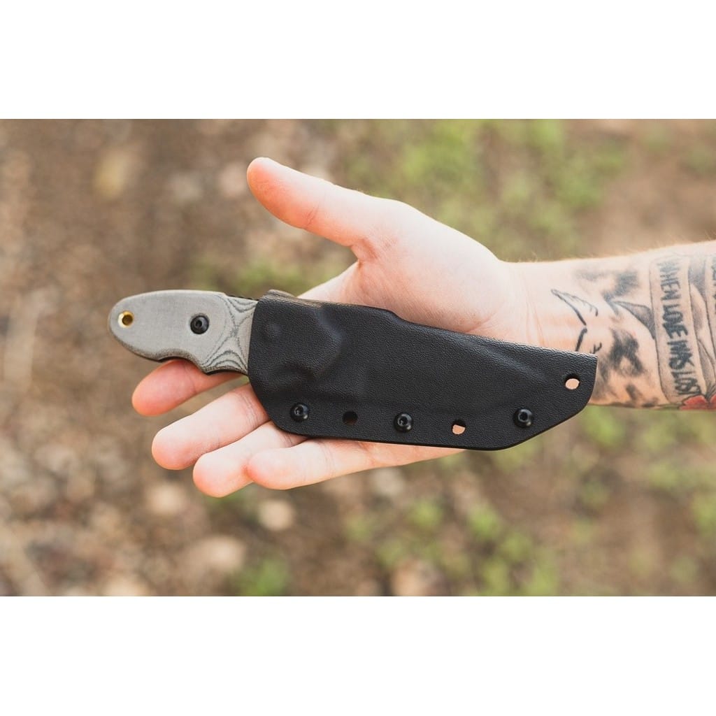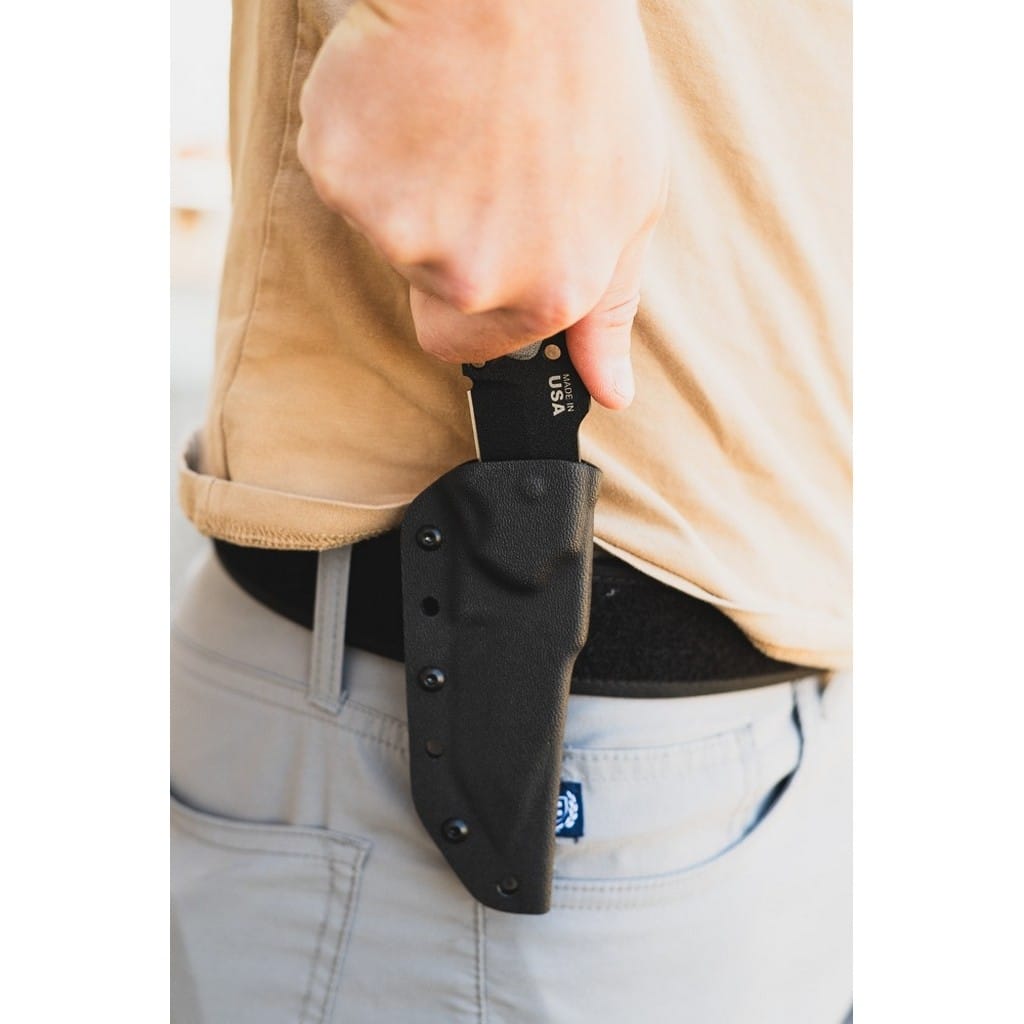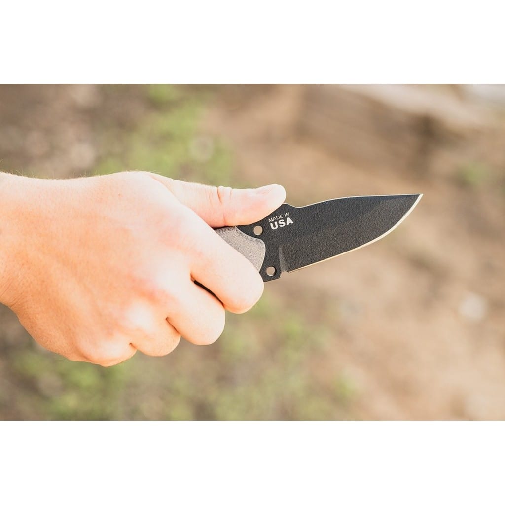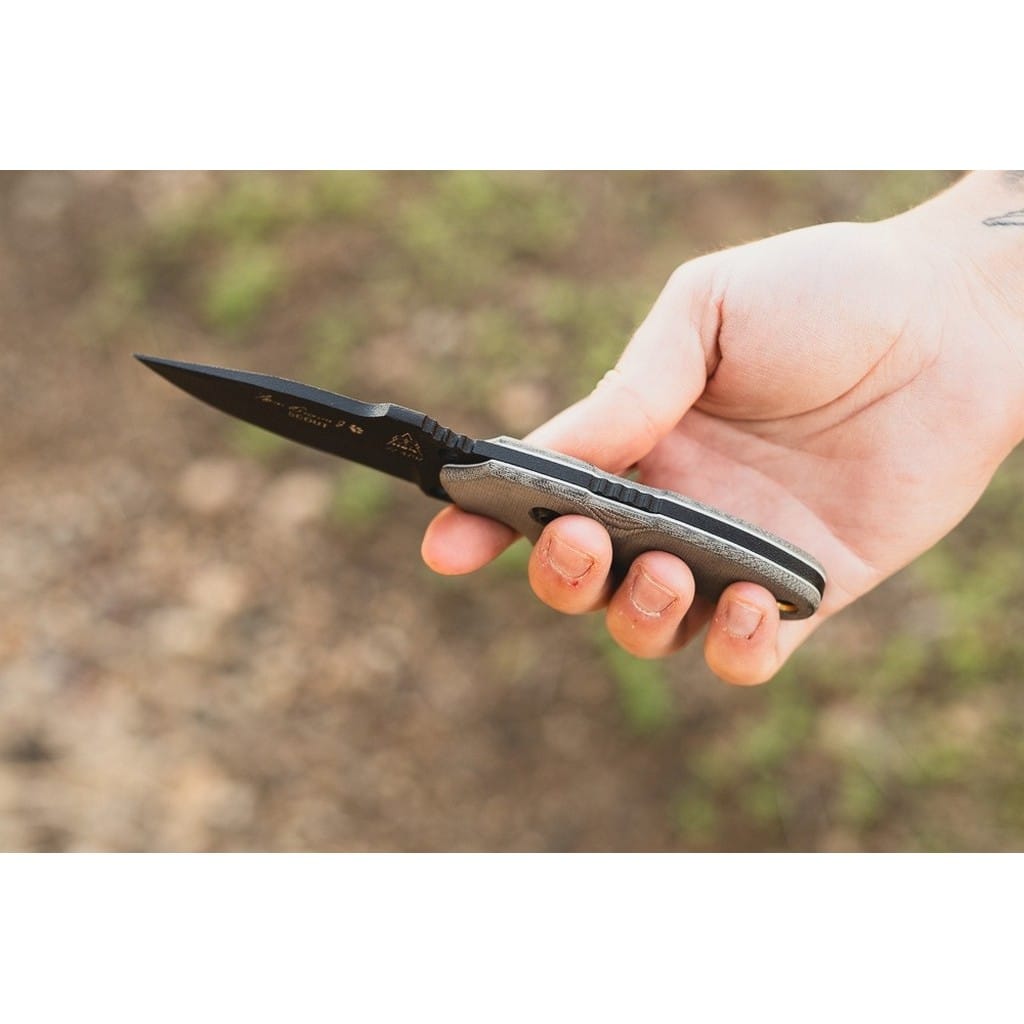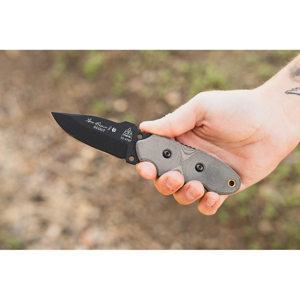 Tracker Scout to kompaktowy nóż EDC zaprojektowany przez amerykańską firmę TOPS Knives z myślą o codziennym noszeniu. Ostrze o uniwersalnym profilu Drop Point zostało wykonane ze stali węglowej 1095 odpornej na wykruszenia i pęknięcia oraz niesprawiającej trudności w ostrzeniu. W celu zabezpieczenia przed korozją i negatywnym działaniem czynników zewnętrznych głownię pokryto antyodblaskową powłoką Black Traction. Jest to zastrzeżona nazwa wykończenia stosowana przez producenta, składającą się z hybrydowej bazy epoksydowej z dodatkiem poliestru. Nakłada się ją proszkowo na klingę i zapieka w piecu przez kilkanaście minut, w temperaturze około 210 stopni Celsjusza. Karbowany grzbiet ostrza i wypustka stanowią stabilne wsparcie dla kciuka i poprawiają kontrolę nad nożem. Do wytrzymałej konstrukcji full tang przymocowano okładziny z Micarty o fakturze płótna. Ergonomicznie wyprofilowana rękojeść komfortowo leży w dłoni użytkownika gwarantując pewny chwyt. Otwór na zakończeniu umożliwia przełożenie paracordu i stworzenie oplotu na nadgarstek. Całość dopełnia pochwa z kydexu wraz z obrotowym klipsem. Pozwala na wygodne przenoszenie narzędzia blisko ciała lub przy wyposażeniu oraz pod dowolnym kątem. Do kompletu dołączono również gwizdek survivalowy o mocy 116 decybeli, który z powodzeniem możemy zamocować przy kluczach w formie breloka lub schować do kieszeni. Misją TOPS Knives jest produkowanie noży najwyższej jakości, charakteryzujących się wydajnością i niezawodnością podczas pracy. Firma współpracuje z projektantami posiadającymi odpowiednie doświadczenie militarne i outdoorowe. Ich produkty tworzą osoby z różnych środowisk, żołnierze Navy Seals, Rangersi, instruktorzy sztuk walki, członkowie zespołu SWAT, a nawet indiańscy eksperci od broni. Wszystkie narzędzia są wytwarzane i ręcznie wykańczane w zakładzie w USA, w sercu gór skalistych.